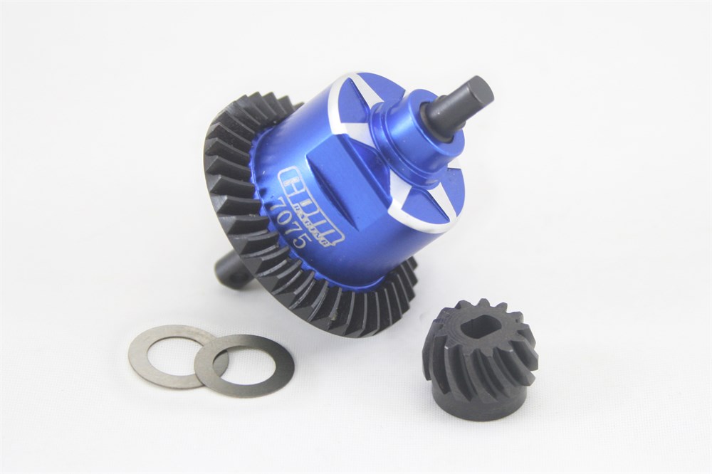 Дифференциал GPM задний косозубый из углеродистой стали в алюминиевом корпусе + приводная шестерня дифференциала для радиоуправляемых моделей Remo Hobby 1/10, 1/8, Traxxas Slash